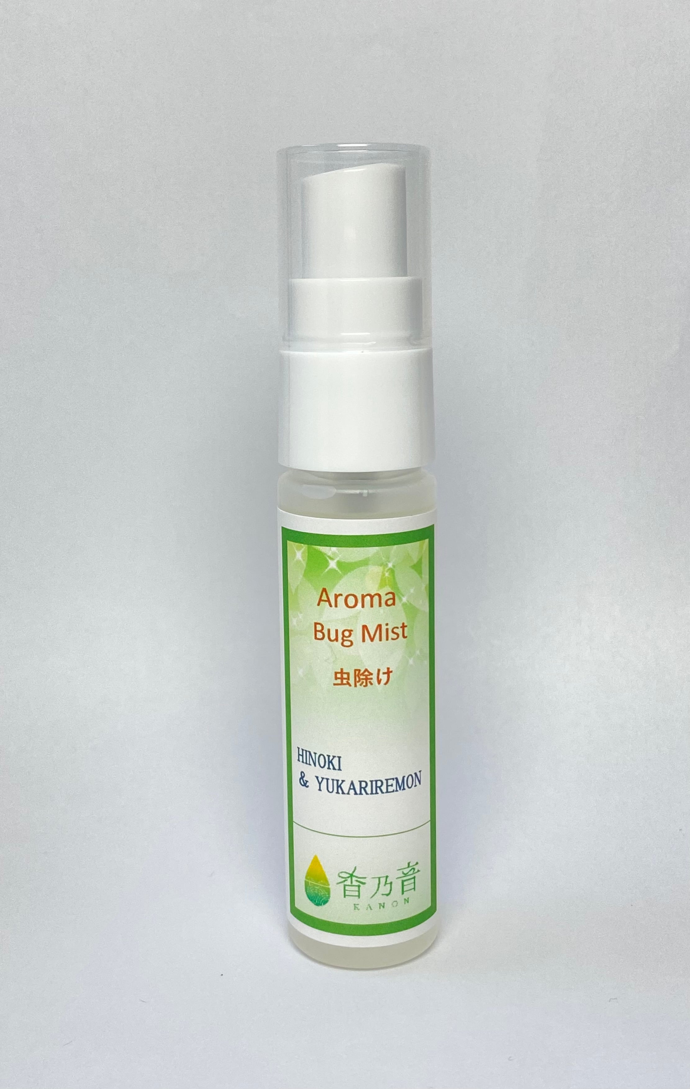虫除けミスト(Aroma Bug mist)は、天然の精油を使用したナチュラルな虫除けアイテムです。平戸ひのき精油、ユーカリレモン、ペパーミントなどを配合しています。心地よい香りを楽しみながら、アウトドア活動やガーデニング、日常の散歩などで、安心してご使用いただけます。